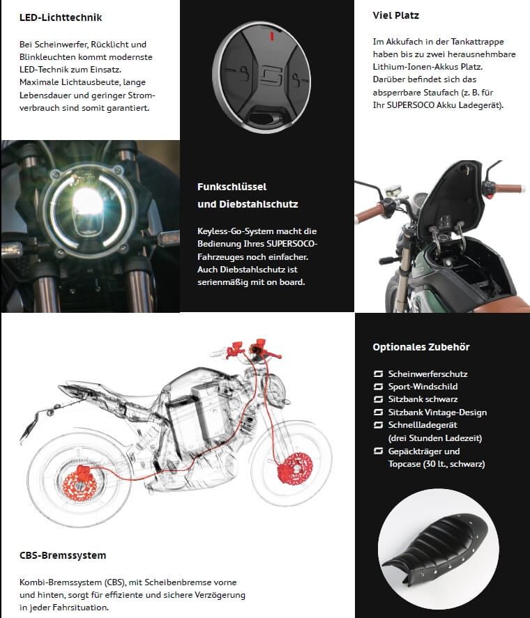 Die Super Soco TC ist für 2 Personen zugelassen und kann mit einem Führerschein der Klasse M oder dem Autoführerschein gefahren werden.